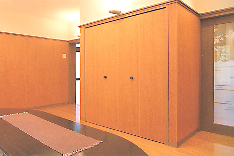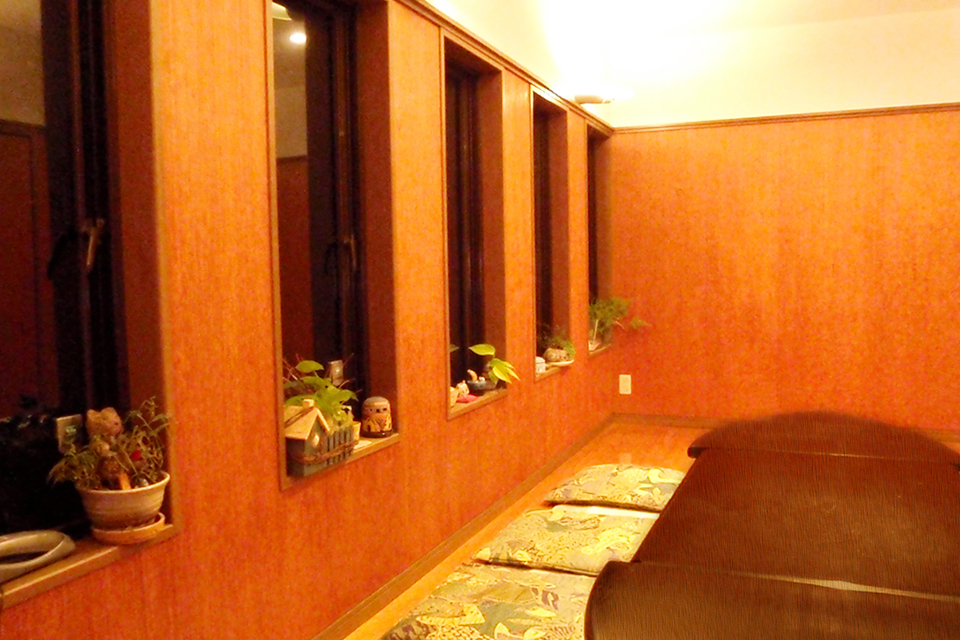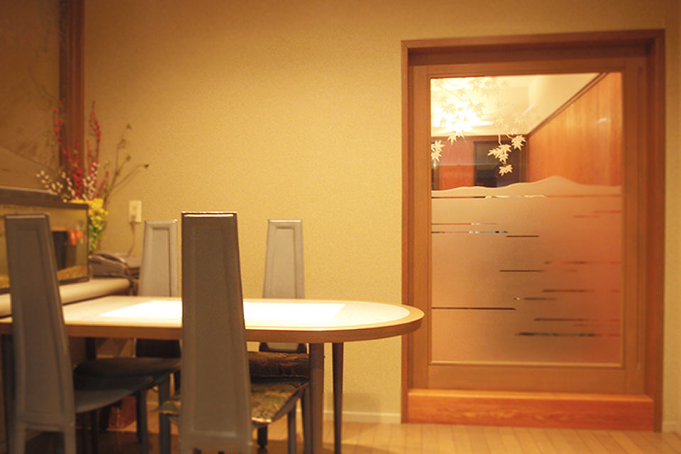 ・間仕切りのガラスには、赤を想わすもみじのエッチング。