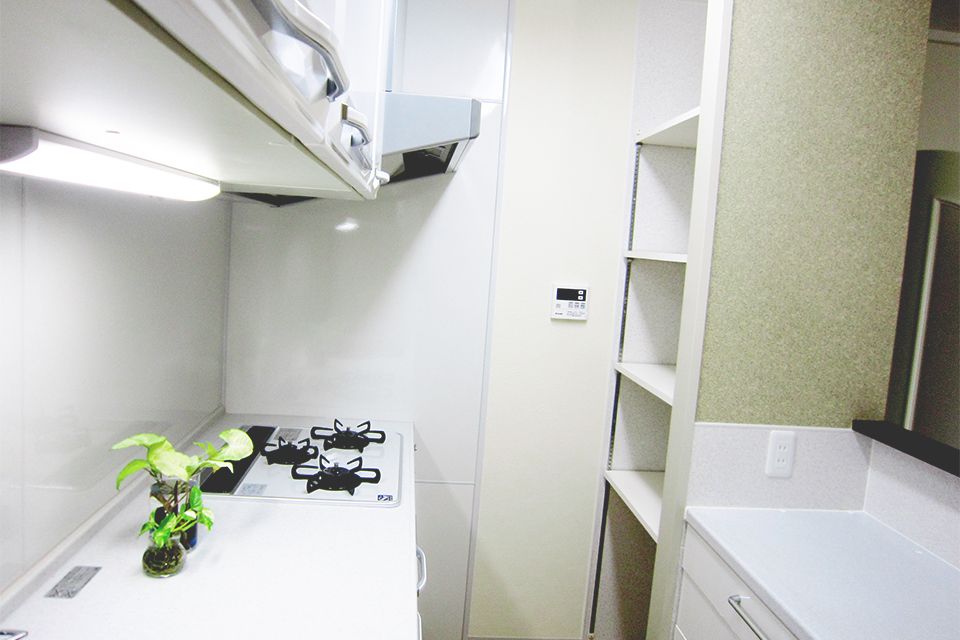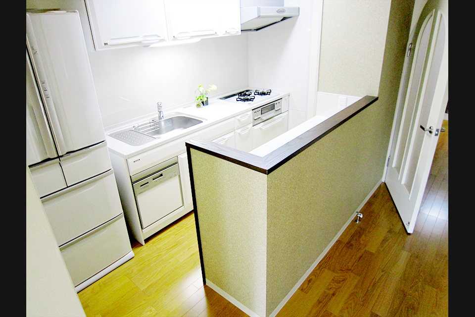 ・配管等の都合上、壁際に流し台を設置する場合、背面カウンター収納を介して対面式にすることも多いです。