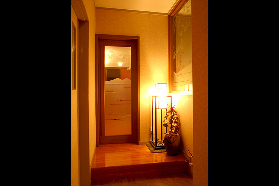 ・間仕切りのガラスには、赤を想わすもみじのエッチング。