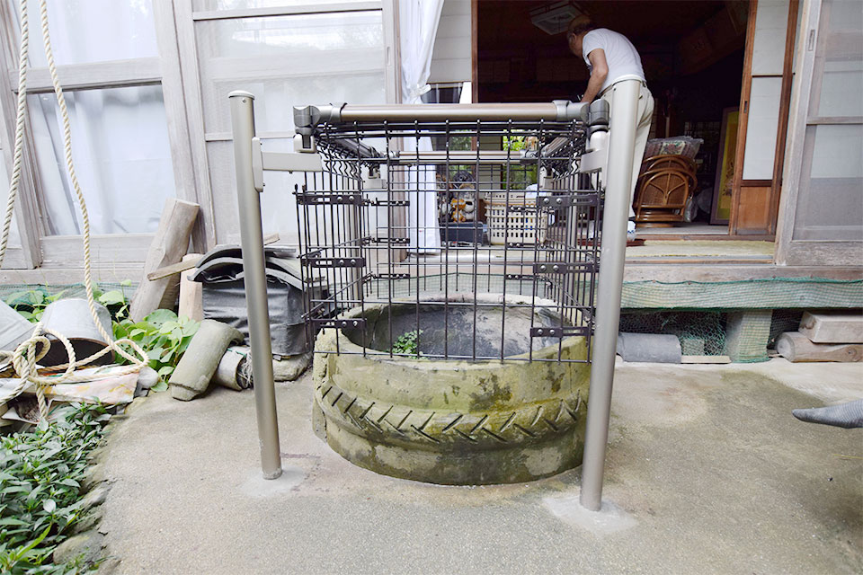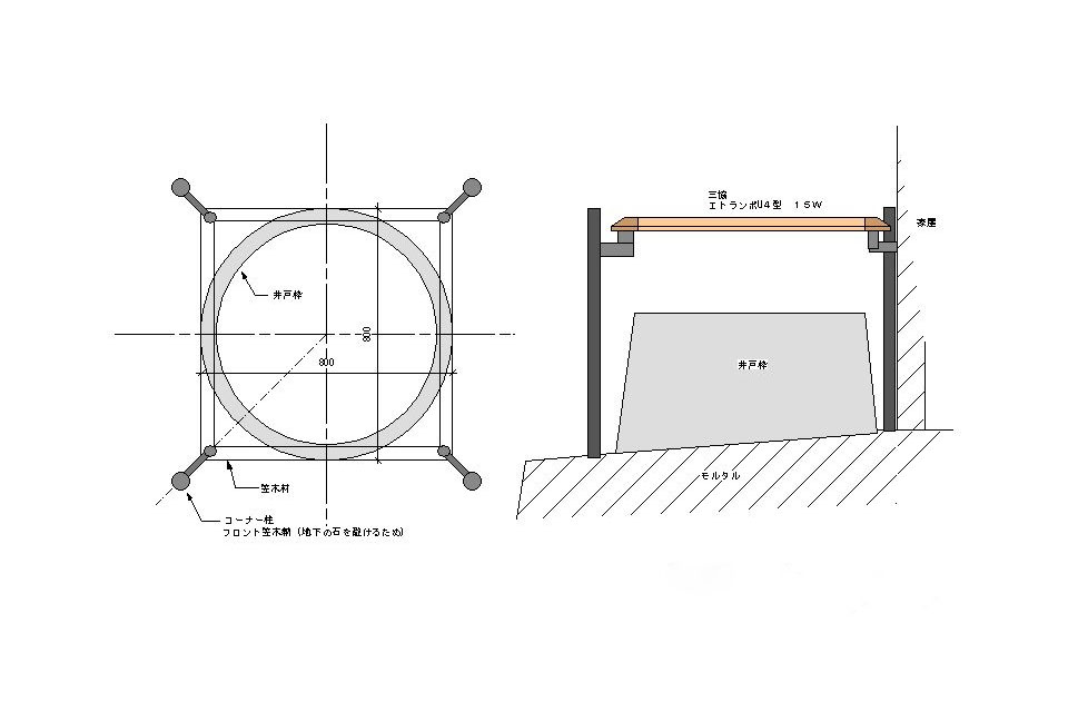 ここのお宅は「つるべ」で汲み上げておられるため、桶が取り込み易い様に手摺枠を出来るだけ井戸枠の近くに形作り、支柱は地下の井戸石垣に影響しないようにオフセットした支柱で対応しました。