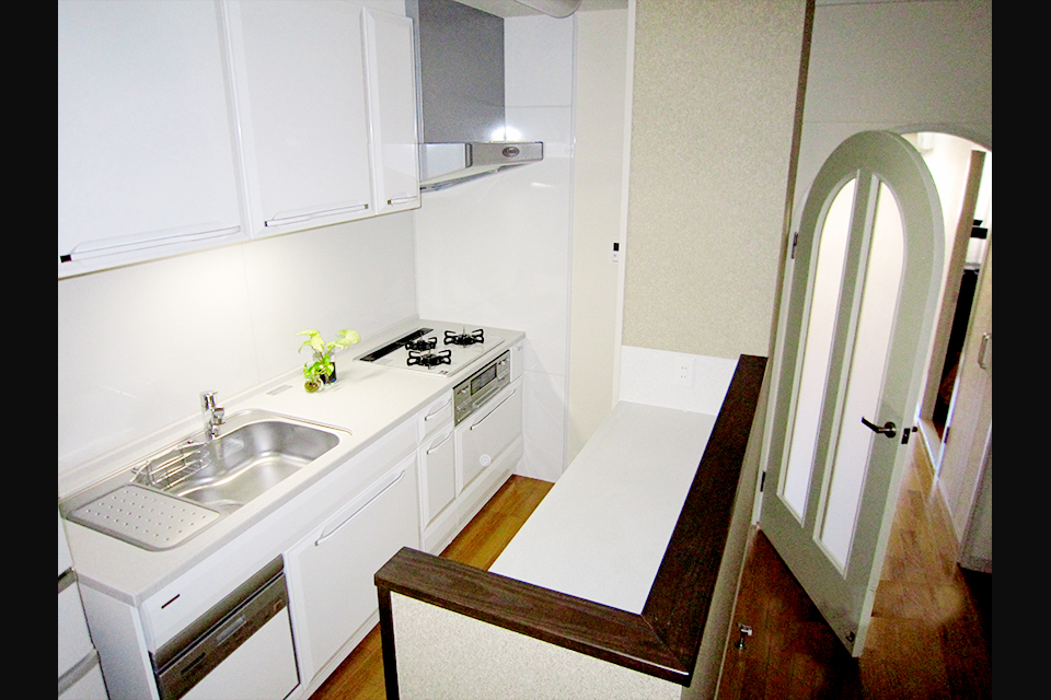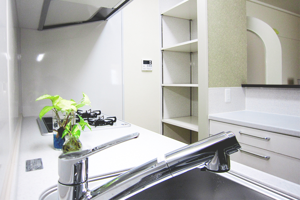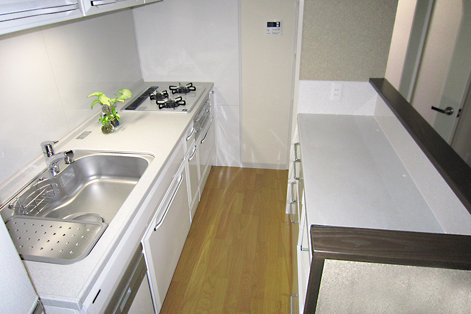 ・配管等の都合上、壁際に流し台を設置する場合、背面カウンター収納を介して対面式にすることも多いです。