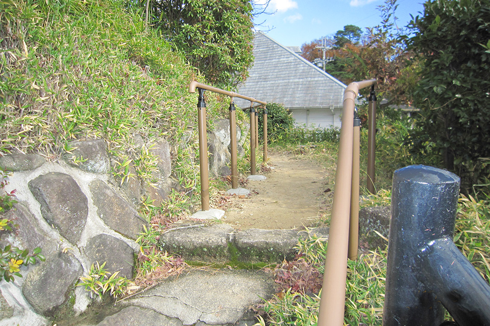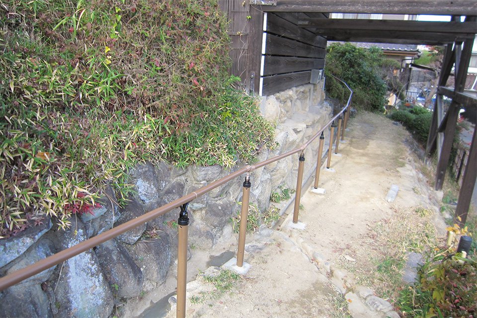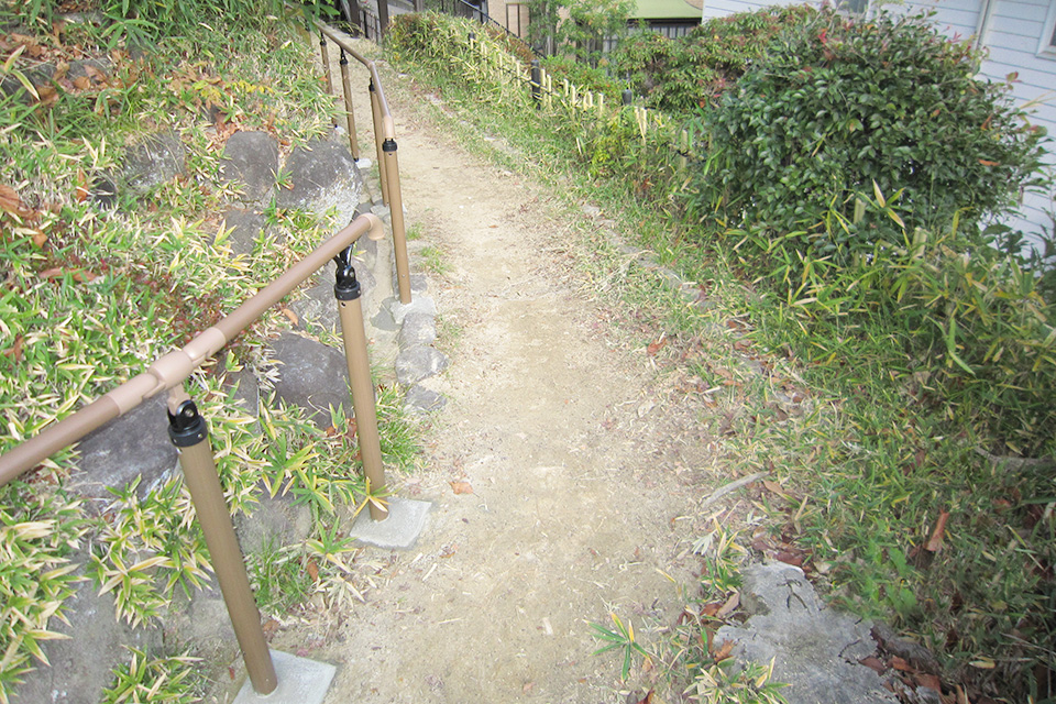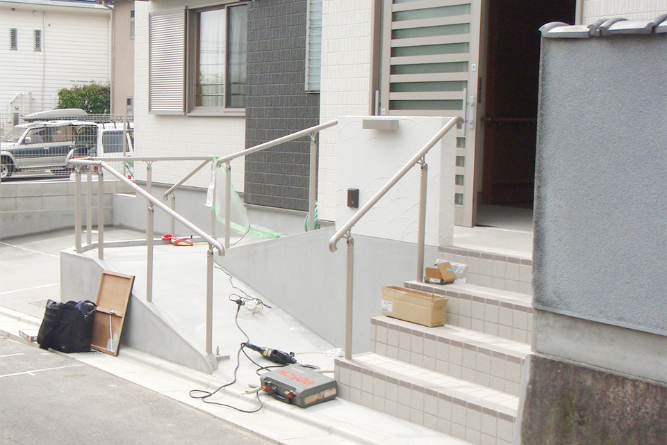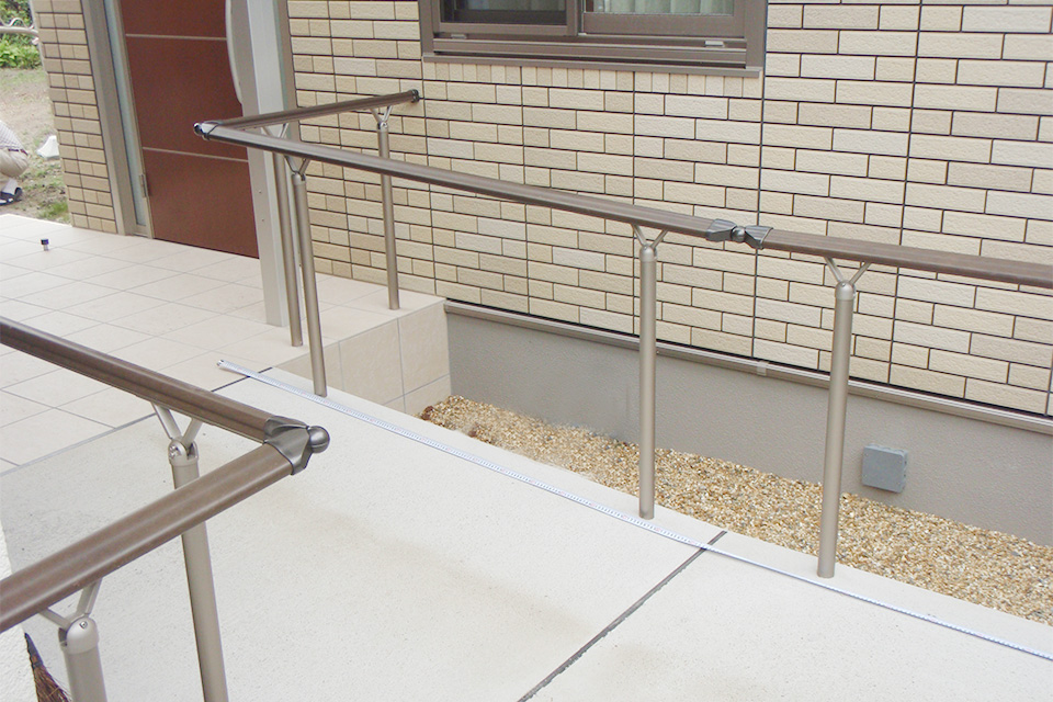 ・手摺りの端部は衝突時の安全を考え、下方向または壁方向に曲げると良いです。